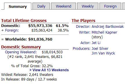 《致命罗密欧》票房表现堪称惊艳,影片未能在中国市场上映,仍在全球狂收9103万美金(约合6.2亿人民币),李连杰再一次轰动了好莱坞,被全球影迷熟知!