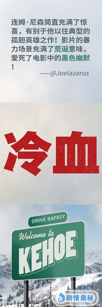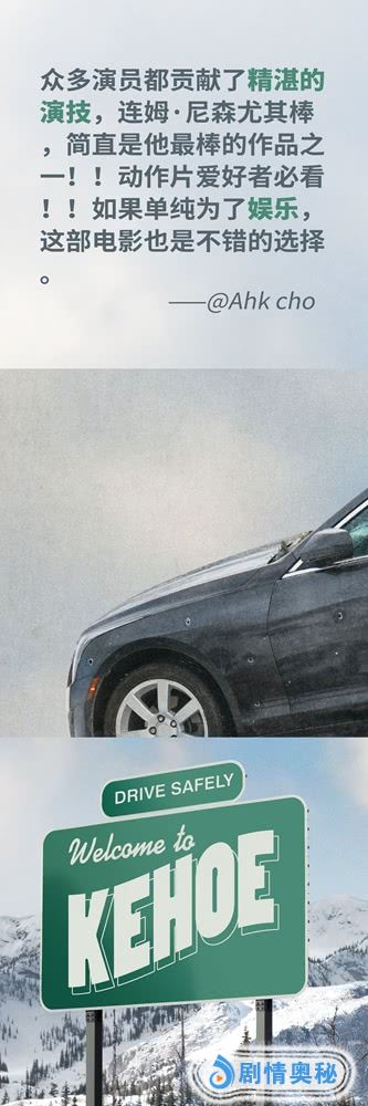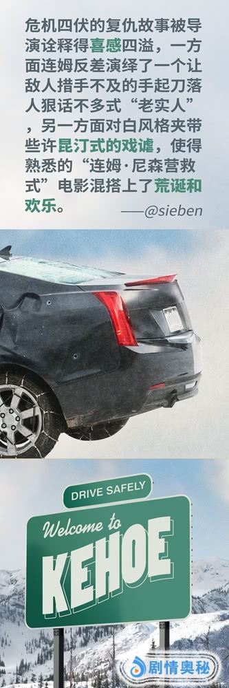 不老男神连姆·尼森单人扛枪,一路“雪地厮杀”、接连上演惊心动魄的“冷血复仇”,持枪驾铲雪车开启怼天怼地怼毒枭之旅。网友大呼“过瘾”,赞其为《飓风营救》之后最棒的犯罪惊悚片之一,“不同于尼森以往的动作片,此次他有更为丰富的内心戏,献上了一次十分特别、独到的表演”,“一方面连姆反差演绎了一个让敌人措手不及的手起刀落人狠话不多式“老实人”,另一方面对白风格夹带些许昆汀·塔伦蒂诺式的戏谑,使得熟悉的“连姆·尼森营救式”电影混搭上了荒诞和欢乐。”