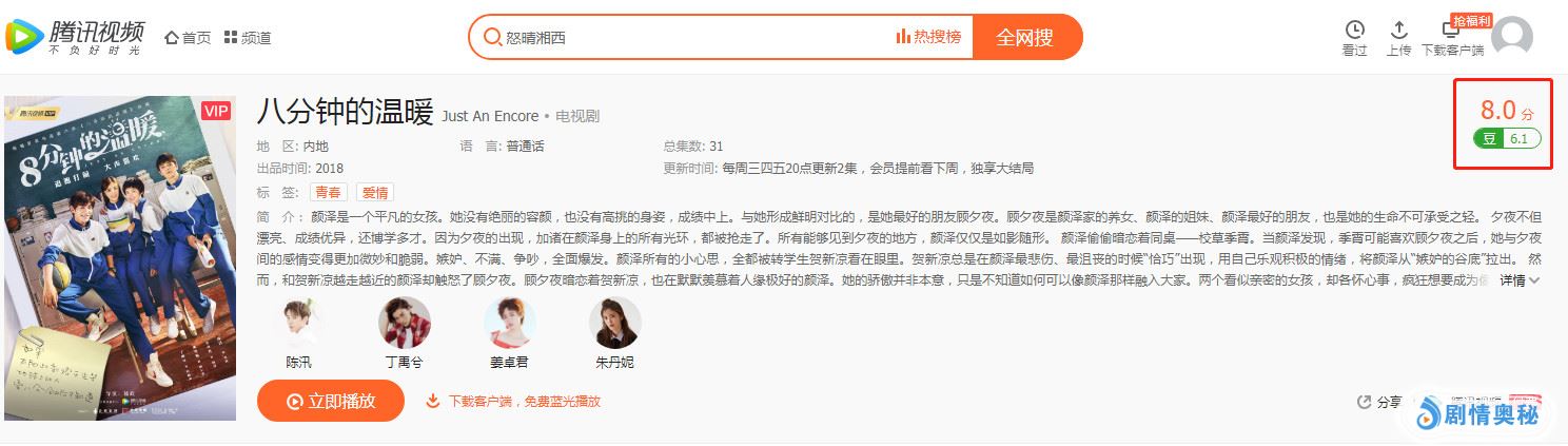 而在刚刚步入2019年之际,随着《怒晴湘西》、《独家记忆》和《八分钟的温暖》等多部剧的热播,网剧再一次掀起了观众观剧的热潮。这里特别要评价的是由导演嵇政执导,陈汛、丁禹兮、朱丹妮等人主演的青春校园剧《八分钟的温暖》。该剧于2月30日在腾讯视频独家播出,随后腾讯视频给出了高达8.0的高分,同时随着该剧的热播,也得到了观众和网友的一致好评。