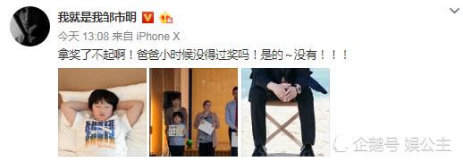 哪个爸妈不是望子成龙,望女成凤?如果自己的孩子有一点小成绩的话,父母都会为之骄傲的!邹市明家的轩轩可能是得奖了,邹市明现发一条微博称“拿奖了不起啊,爸爸小时候没得过奖吗!是的~没有!!!”