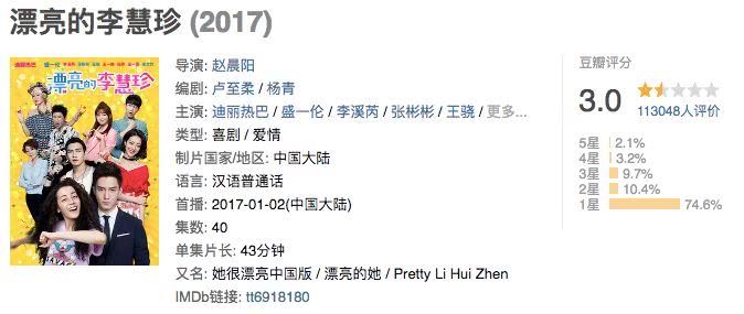 网友因不满纷纷跑去豆瓣狂给《漂亮的李慧珍》刷一星,迪丽热巴也获封“金鹰水后”。