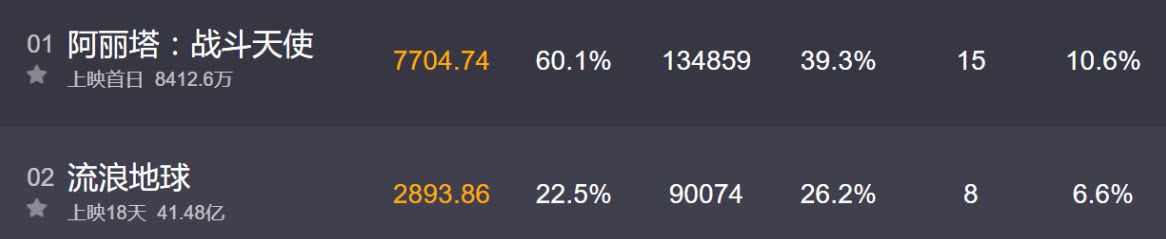 截至22号17点《流浪地球》已经大幅度落后于新片《阿丽塔:战斗天使》