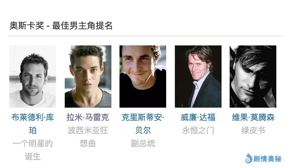 今年男主五个提名者,布拉德利·库珀三次入围奥斯卡(两次男主一次男配),克里斯蒂安·贝尔四次入围奥斯卡(两次男主两次男配,凭借《斗士》获得男配),维果·莫滕森三次提名奥斯卡,威廉·达福四次提名奥斯卡(不过前三次都是男配,这次是首次拿到男主提名)。