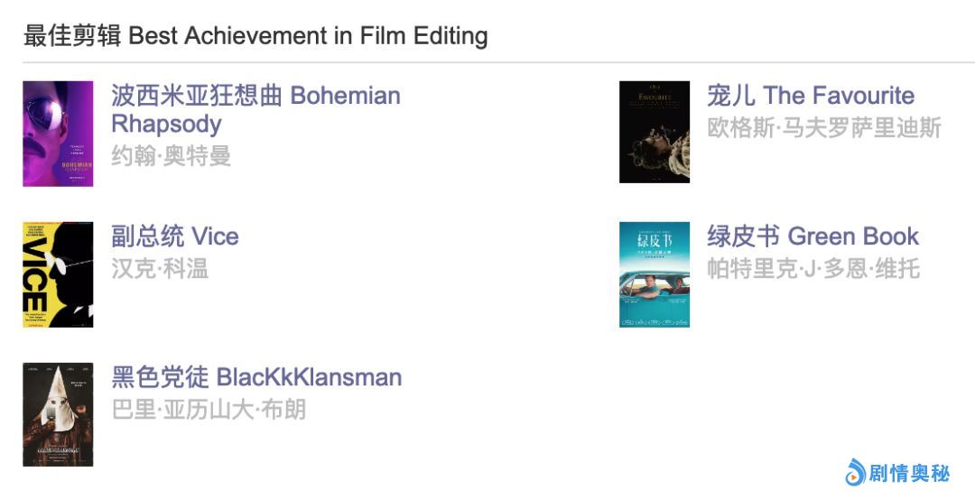 暂时来看,大家机会均等,没有谁会那么突出。相比之下,《副总统》仍是当年《大空头》那种花哨的剪辑,可能会更抢眼一点。但是,也千万不能小看《波西米亚狂想曲》啊,该片刚刚拿到剪辑工会最佳剧情片剪辑,这个剪辑师约翰·奥特曼,当初还凭借《非常嫌疑犯》拿过奥斯卡。