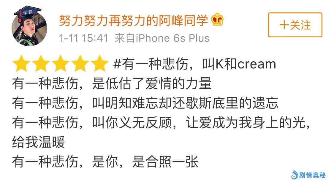 片方发布的“唯一的吻”版海报,表现出Cream与K之间无法抑制的浪漫情愫,眷恋、珍惜、刻骨、深爱、克制等复杂情绪几乎破屏而出,足见这段感情的珍贵。他们携手谱写的这首爱情恋曲,以相知相守为甜暖序曲,以相爱却面临重重困难为虐心高潮,结局将走向何方,才会比悲伤更悲伤?关系走向让人格外期待。