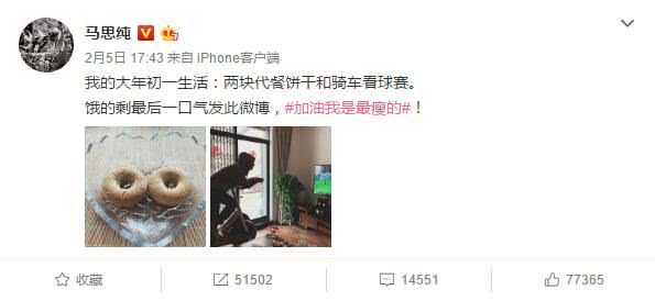 大年初一,所有人都在心安理得的躺着狂吃狂喝,称:长胖是对春节最好的尊敬,春节不长胖,怎么对得起死去的鸡鸭鱼肉。而马思纯大年初一,吃的是两块代餐饼干,然后骑车看球赛,就算春节休假陪爸妈去东京玩,一样去健身房打卡。