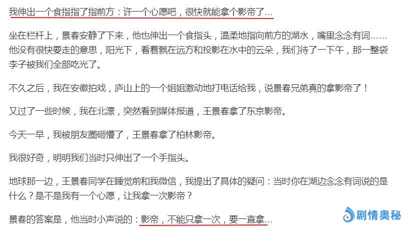 王景春喜提柏林银熊后,喻·真博士·恩泰发表了长文,回顾他曾经跟王景春一起在庐山的一个大湖边许愿,王景春当时的愿望就是「一直拿影帝」。