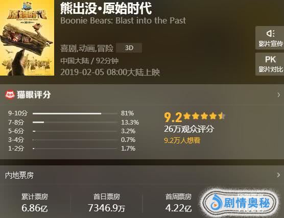 《熊出没·原始时代》是《熊出没》系列第6部动画电影,于2019年2月5日在中国内地上映。作为一部动画片,该片一开始其实并不怎么被看好,尤其是在今年春节档大片云集的情况下,很多人对《熊出没》的票房预测只有两三亿。