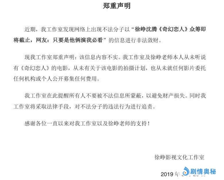 就在近日,网络爆出“徐峥沈腾《奇幻恋人》众筹即将截止,网友:只要是他俩演,我必看 ”,该传闻最早曾经出现在去年年底一些自媒体账号上,但在2月20日当天,徐峥影视文化工作室发出声明,表示《奇幻恋人》项目不存在。