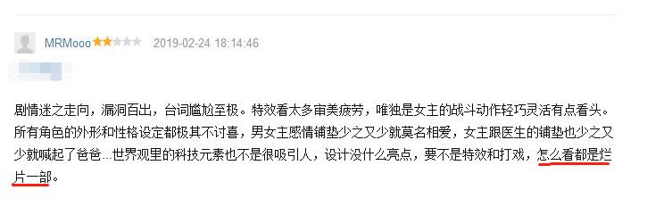 可惜的是,影片在赢得票房的同时,却在口碑上扑街了。全球较为权威的影评网IMBD以及国内豆瓣网均只给了7.6的中等评价,观影之后的网友更是对影片产生了质疑,表明影片《阿丽塔》非常不像卡梅隆的电影,它也非常不像罗伯特.罗德里格兹的电影。整部影片除了特效,几乎一无是处,实在是令人大失所望。甚至还有网友吐槽到:烂片一部。
