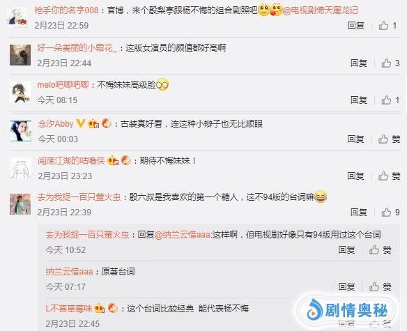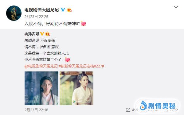 定妆照以及新剧照一出,观众印象中敢爱敢恨、善良单纯的不悔妹妹的形象就更加清晰了!粉绿相映的服饰,衬托出少女的娇柔;看似简单的小辫子配上点睛的小首饰,也不失江湖儿女的气魄。剑眉星目,不卑不亢、爱恨分明的杨不悔仿佛鲜活灵动在眼前!为了宣传杨不悔,扮演她的孙安可笑姐姐还特地用了94版的经典台词(这是我第一个喜欢的糖人儿......),同时也是原著的内容,可见用心。官博也大赞:入股不悔。想来也喜爱极了这位善良的姑娘吧!
