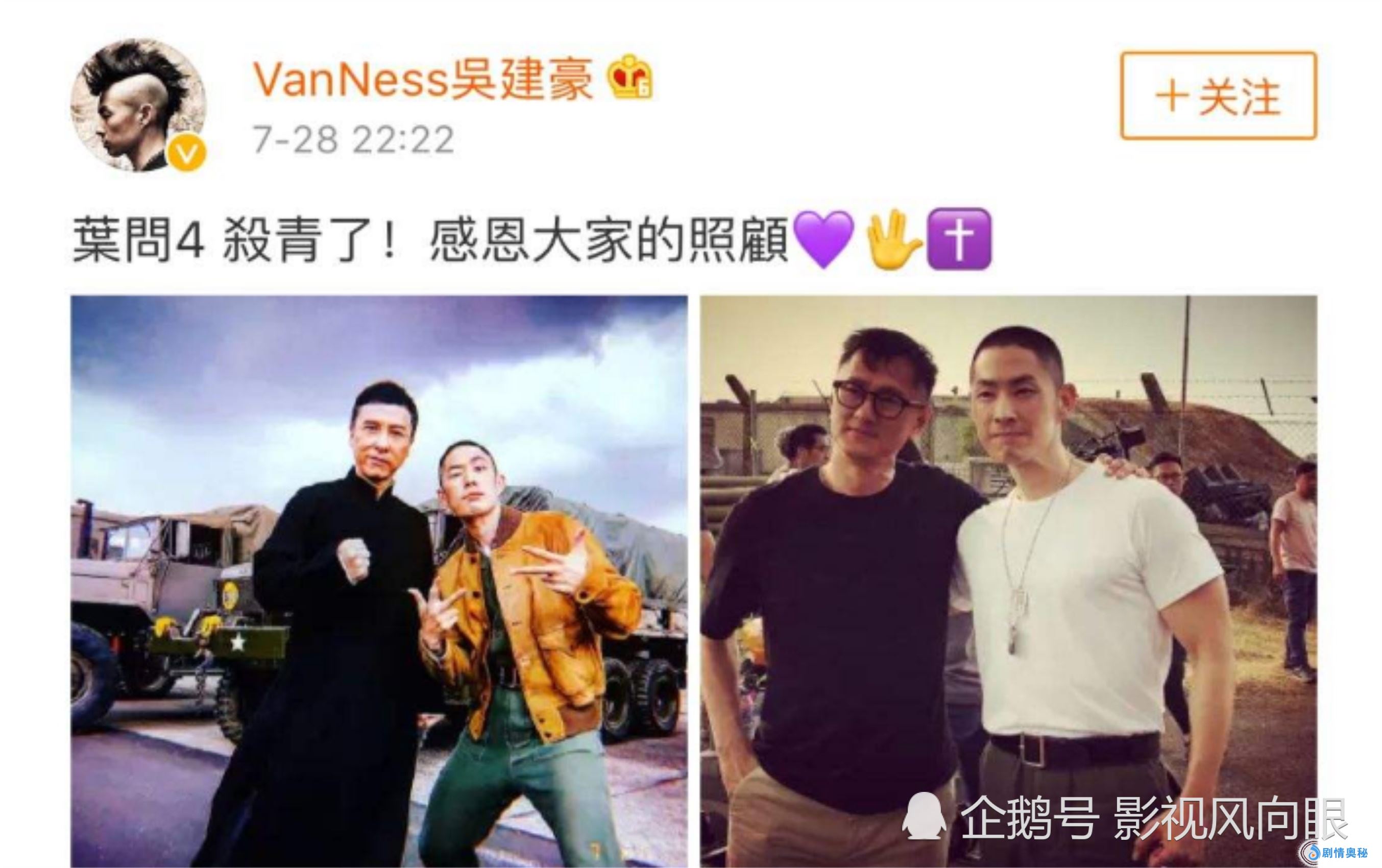 吴建豪加盟的《叶问4》也已经杀青了,与甄子丹合作的吴建豪也是成为了观众关注的对象,因为这一部《叶问4》将成为这个系列的最后一部,所以也是很期待。