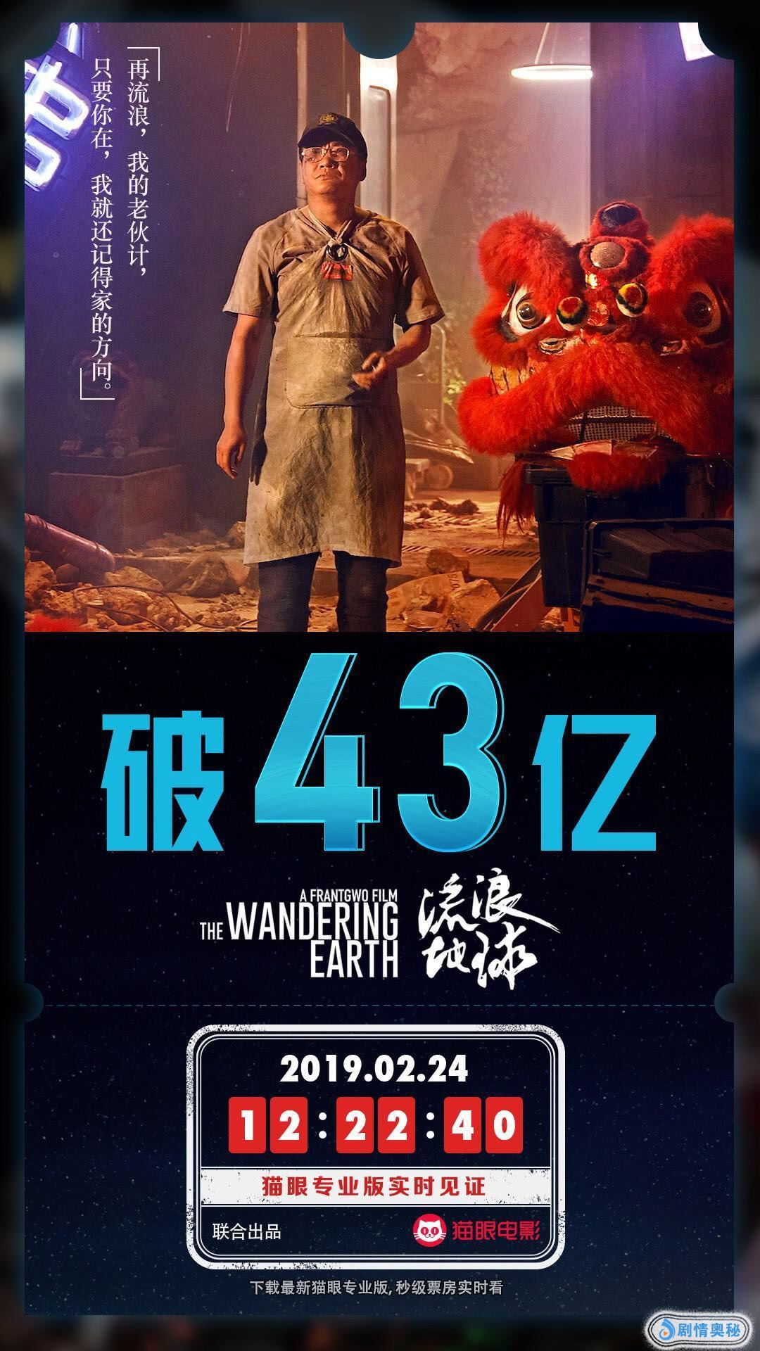 根据猫眼专业版数据,截止2月24日12点22分,《流浪地球》的总票房已经冲破了43亿元的大关。
