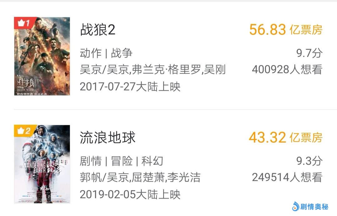 《战狼2》是中国影史票房排行榜冠军,《流浪地球》是亚军,都由吴京主演,太厉害了。