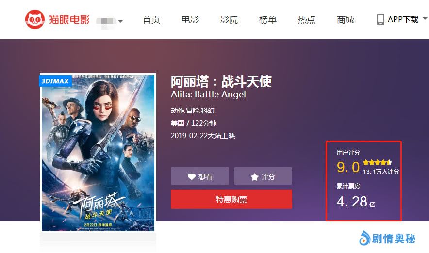 如今,时隔10年后,我们等来的不是卡梅隆亲自执导的《阿凡达2》,而是由他监制的影片《阿丽塔:战斗天使》。该片于2月22日在中国内地上映,除了日票房破亿,该片口碑上更是一度爆表,猫眼和淘票票均给出了9.0,在票房和口碑双丰收的情况下,使得影片一度在同档热映的多部影片中脱颖而出。