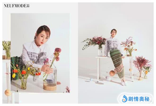 身穿白色衬衣和网格长裙的杨紫,站在缤纷的花束中,身后是白色的墙面背景,这样看起来杨紫也像是融入花堆中的一束无暇的花,束腰长裙显得腰身纤细,身材超棒。