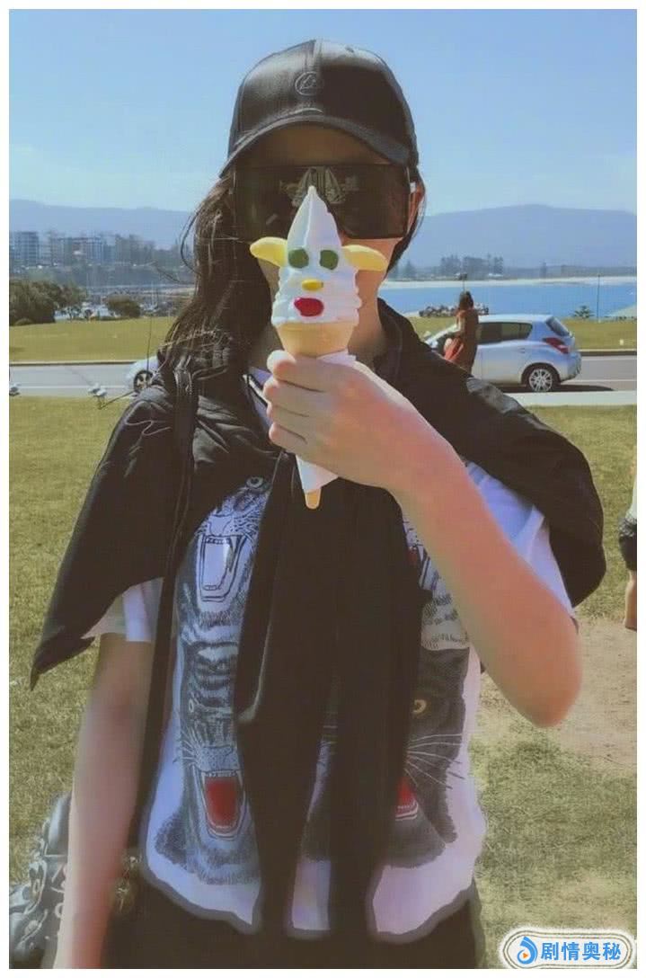还有这张秀可爱冰激凌的照片,戴着一顶黑色棒球帽,大黑超墨镜,黑色外套随意的系在肩上,左手把冰激凌举在脸前,完全就是将自己作为陪衬来照亮冰激凌嘛。如果换做别人来发这张照片,大概会把手P一下,让小臂看起来纤细修长一点!
