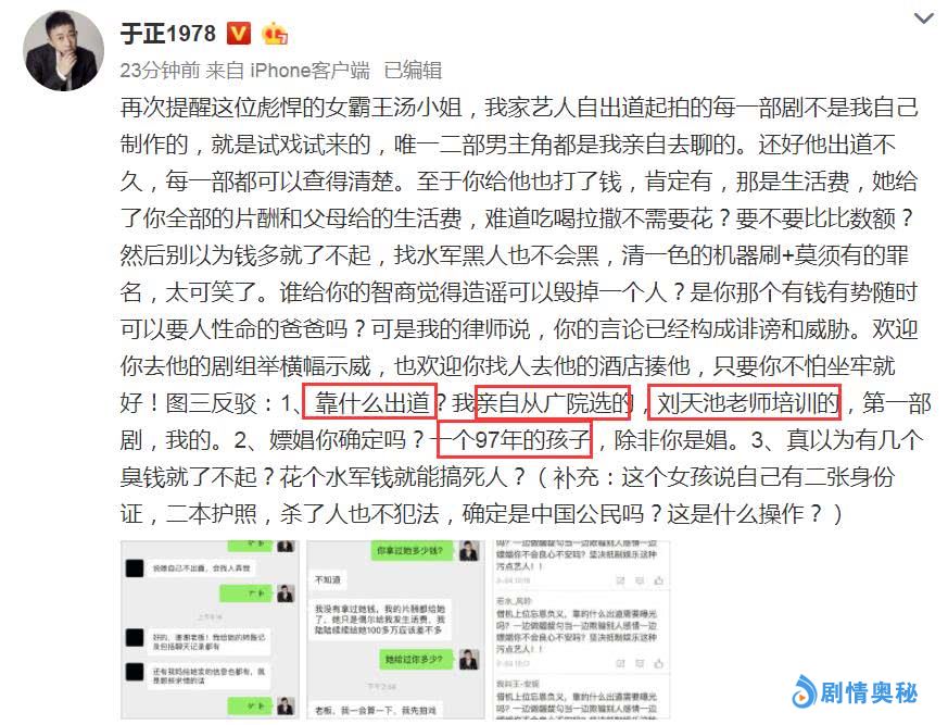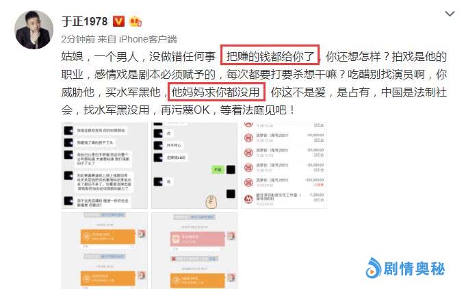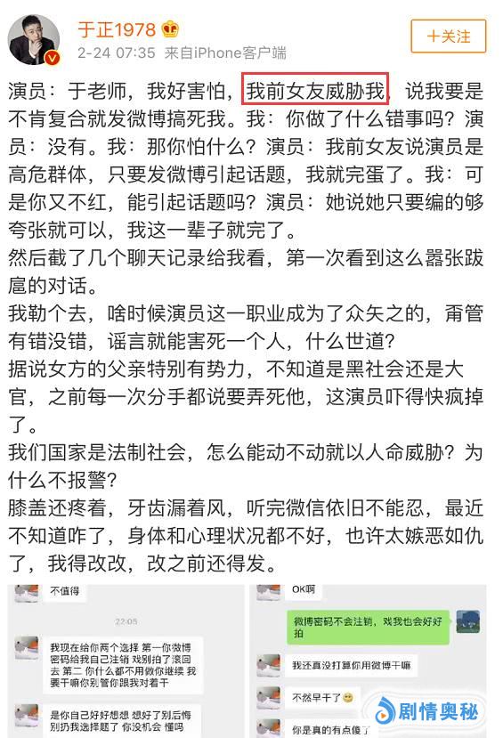 于正旗下男艺人被前女友恐吓,疑似女方不是富二代,初中被包养,在2月24日上午7点多,于正发长文,说出了自己公司旗下的艺名新人男演员,遭到了前女友的各种恐吓,要求复合,否则就让其在娱乐圈混不下去!