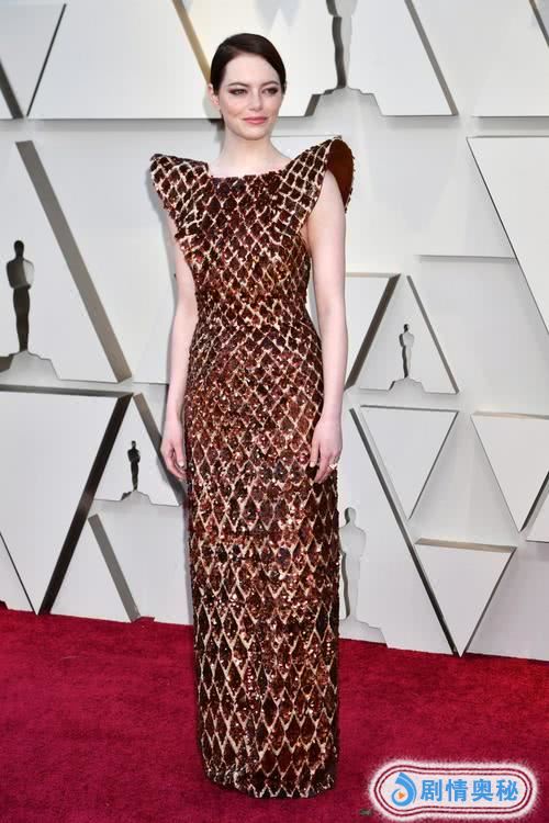 相比而言,“石头姐”艾玛·斯通今天的裙子算是最得体的了,尽管会让密集恐惧症的观众有些心理不适,她的问题是耳钉太小了,手腕和脖子也没有配饰。