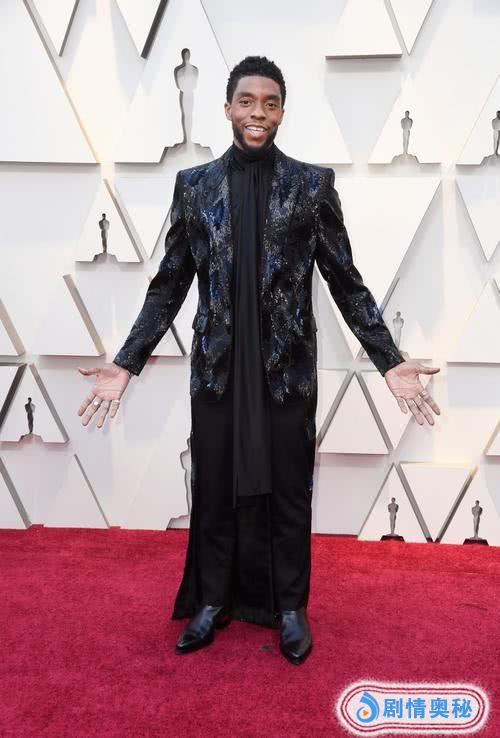 难道是事先约定?“黑豹”查德维克·博斯曼穿着裤裙,配上闪亮的黑皮鞋,今年的摄影师有毒,每个人看起来都很瘦小,这身造型你们来评判吧。