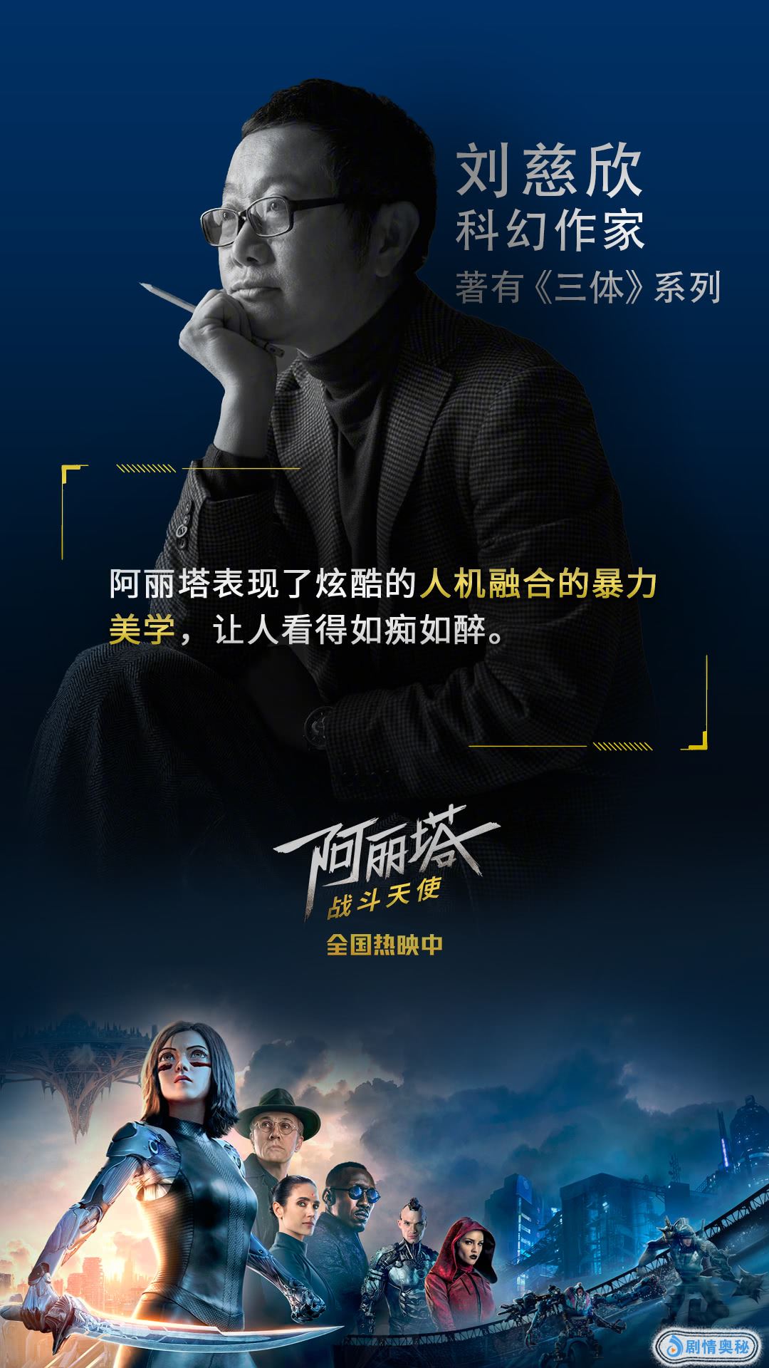 在剧情方面,创作了《三体》的著名科幻作家刘慈欣感言“阿丽塔表现了炫酷的人机融合的暴力美学,让人看得如痴如醉”。