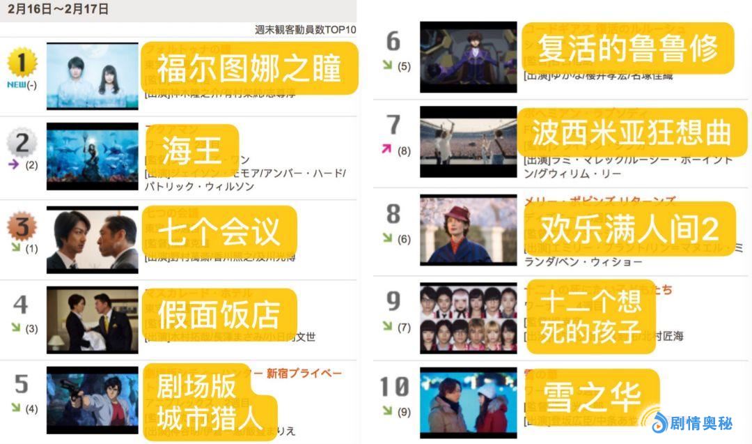 4. 最新日本电影周末观影人数排行榜公布,《福尔图娜之瞳》荣登榜首