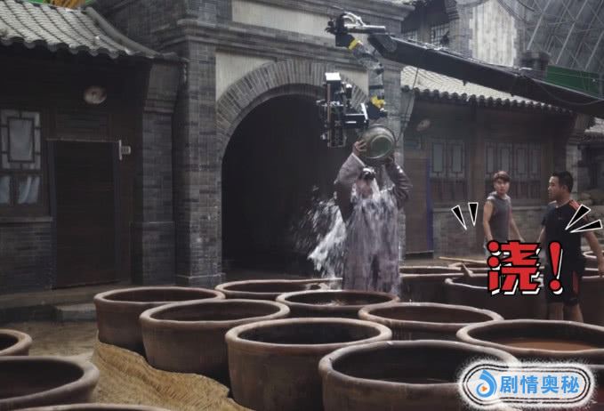 再者,我们看到的掉酱缸画面是一气呵成的。但实际拍摄时,经历了倒(拍摄摔倒的画面)、浇(配合湿漉漉的设定)、掉(真掉进缸中)三个步骤完成的。看何冰一气呵成地把水倒在自己头上就知道,这场戏对他来说没什么太大的难度。