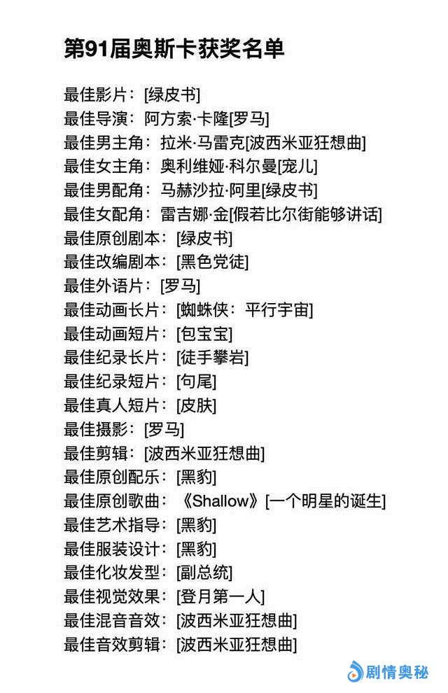2019年的奥斯卡获奖结果已经揭晓,可以品品: