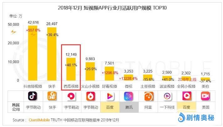 我们再说回到刚被责令整改的西瓜视频,最开始和抖音、火山一起,是今日头条旗下的短视频平台。Questmobile“2018年12月短视频APP行业月活跃用户规模TOP10”数据显示,西瓜视频仅次于抖音、快手,排名第三,月活人数达1.2149亿,并且成长性可观。头条旗下三家短视频平台,分别占据第一、第三、第四的位置,势力庞大。