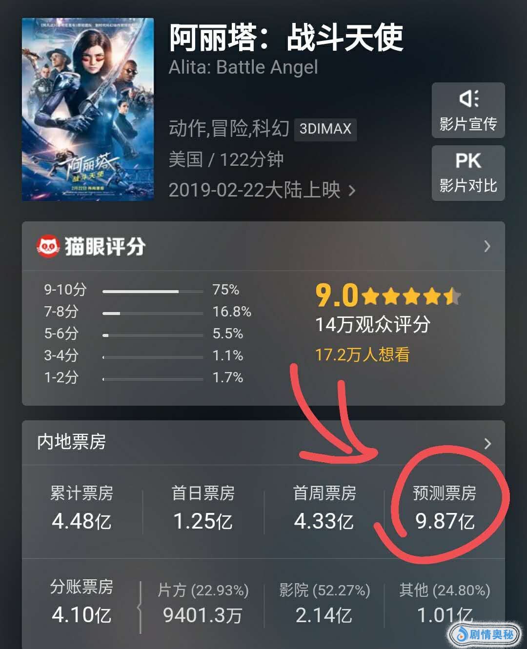 可能也是这个原因,猫眼预测《阿丽塔》的总票房难以超过10亿。