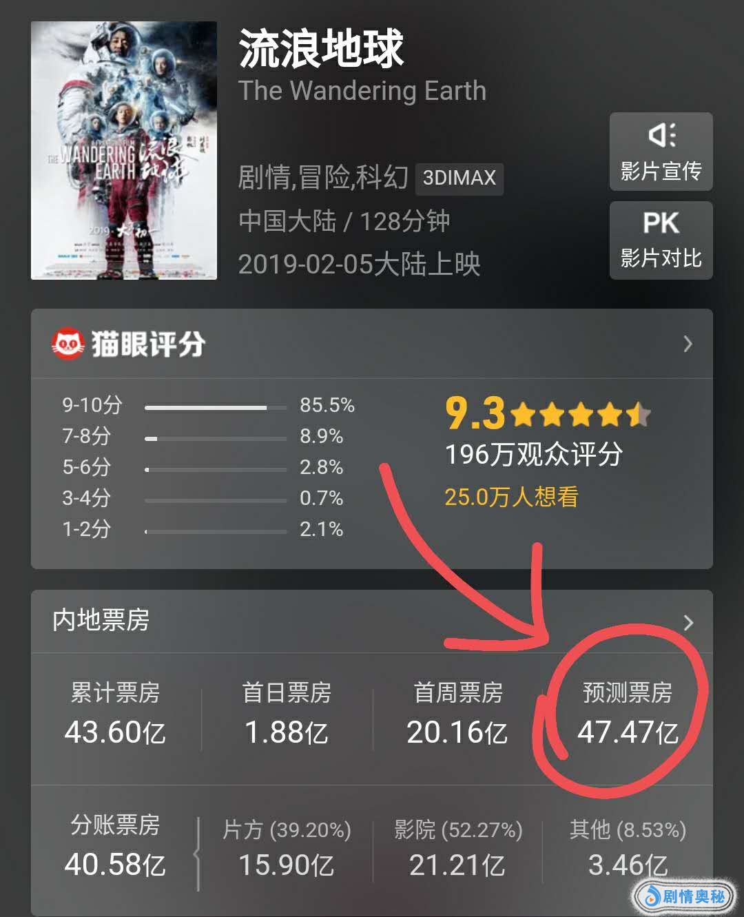 坏消息是,猫眼专业版已经把《流浪地球》的票房预测下调到47.47亿。