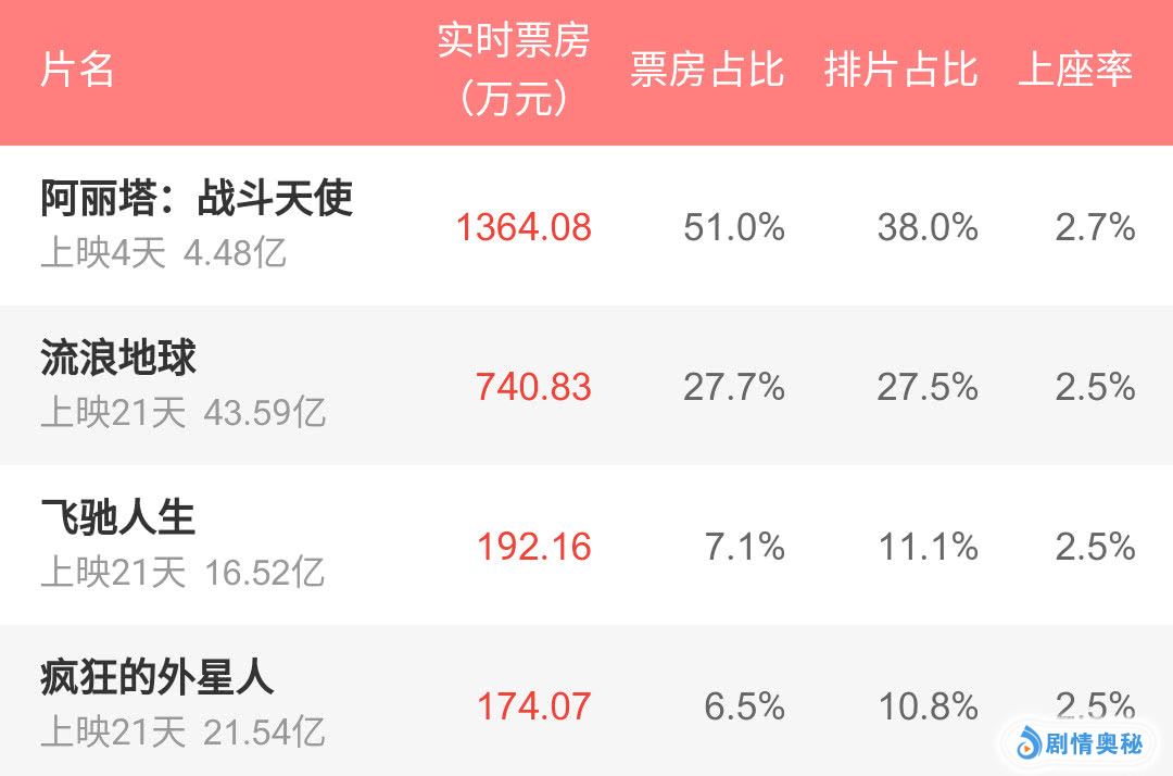 截至发稿时,《阿丽塔》票房狂轰4.48亿,应该说已完成预期目标。在它的挤压之下,《流浪地球》有点狼狈,票房连续好几天都没有过亿。