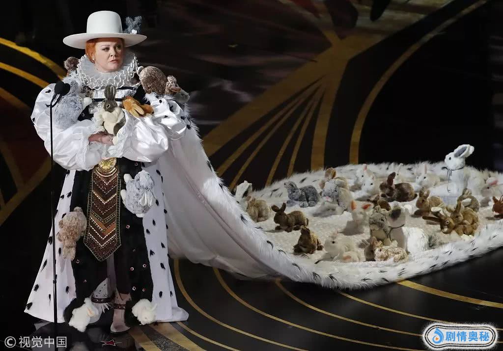 获得最佳女主角提名的梅丽莎·麦卡西为了颁最佳服装设计奖相当拼命,专门换上了这套斥巨资打造的“戏服”,是全场最佳着装没错了,还有手里的玩偶兔子实力抢戏。