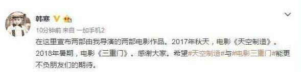 2016年春,韩寒开了一个“要事相告”的发布会,宣布要成立亭东影业,并宣布要开拍两部电影,连上映时间都定档了,2017年上映《天空制造》,2018年上映《三重门》。