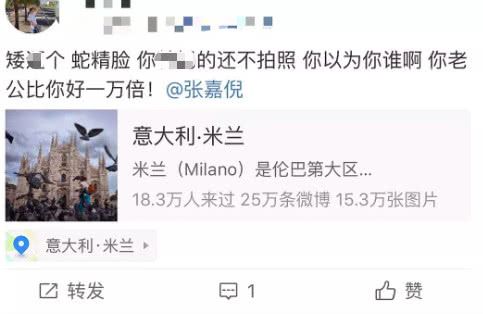有网友在米兰偶遇张嘉倪和买超夫妇,应该是要求合影时遭到了张嘉倪的拒绝,之后发微博怒骂,同时还艾特了张嘉倪。让人意外的是,张嘉倪竟然回复了她的微博,但并没有正面反驳,而是很温柔的说“在米兰遇到好多可爱的朋友,我们都有合影,除了身体不舒服有其他原因,我都不介意合影。还有我老公是很好很好谢谢你喜欢”。