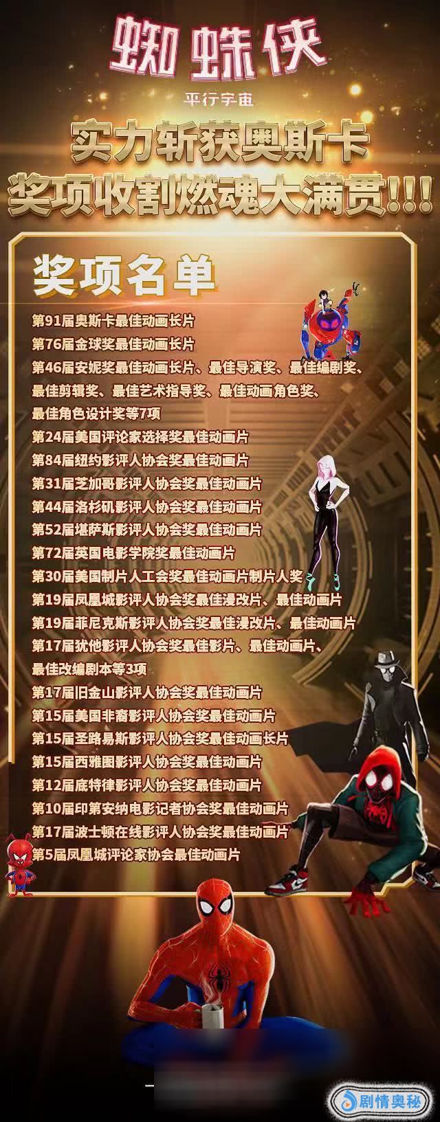 超级英雄电影在今年奥斯卡上表现较为抢眼,漫威《黑豹》拿下艺术指导、服装设计、原创配乐三座奖项,但在最重要的最佳影片奖项上只能沦为陪跑。超英电影真正赢家是索尼影业的《蜘蛛侠:平行宇宙》,斩获重量级的最佳动画长片奖项可谓实至名归,这也打破了迪士尼与其旗下皮克斯连续六年蝉联该奖项的局面。该片以97%烂番茄新鲜度傲视群雄,在IMDb和豆瓣上均达到8.7惊人高分。影片此前已将金球奖最佳动画长片、动画安妮奖最佳动画长片、英国电影学院奖最佳动画片等无数重磅奖项收入囊中,势如破竹般横扫颁奖季,实现了“动画电影全奖大满贯”。《蜘蛛侠:平行宇宙》讲述了六位不同时空的蜘蛛侠联合抗击超强反派的精彩故事,风格鲜明独特,画面潮酷绚丽,颜色大胆跳脱,漫画形式与CG技术完美融合,营造出前所未有的视听体验。索尼影业凭此佳作拓宽了动画电影的创作思路,并为动画电影的水准树立了新标杆。