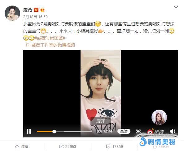 前一阵子狗啃刘海大行其道,男女明星纷纷尝试,戚薇在拍时尚杂志的时候,也大胆体验了一把,但出来的效果不被粉丝接受,竟然有人因为狗啃刘海要脱饭,于是她马上录视频,称那只是一顶假刘海,并且讲解如何才能把狗啃刘海,剪出时髦感。