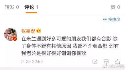 对此,张嘉倪温柔回应称:在米兰遇到好多可爱的朋友,我们都有合影,除了身体不舒有其他原因,我都不会介意合影,还有我老公是很好很好谢谢你喜欢。