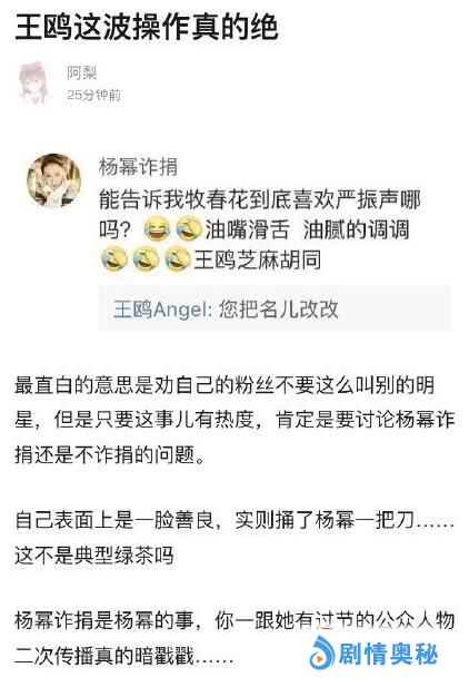 有网友是这样解读的:自己表面上是一脸善良,实则捅了杨幂一把刀,这不是典型绿茶吗?杨幂诈捐是杨幂的事,你跟她有过节的公众人物,二次传播真的暗戳戳。