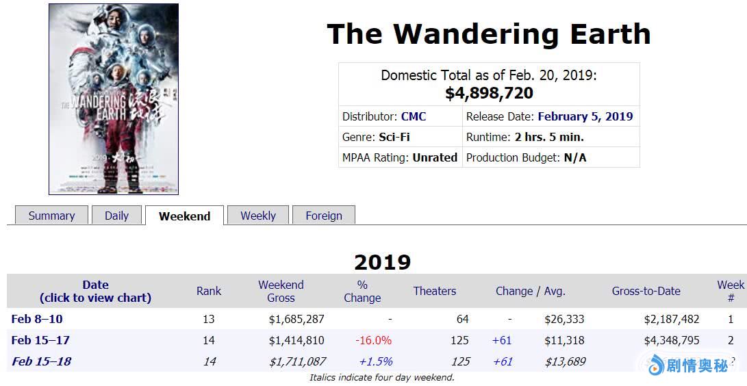 《流浪地球》截止上周三(2月20日)累计489万美元(约3300万人民币),现在最新的票房早就冲破500万美元了。2013年,王家卫《一代宗师》北美大卖了659万美元,想不到多年后有望反超他战绩的竟然会是吴京的大片,这让影坛其他巨星情何以堪?张艺谋《长城》北美大卖了4554万美元,但这部片是中美合拍,连男主角都是外国人严格来说不算纯国产片了。