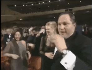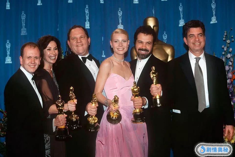 当哈里森·福特打开信封,宣布最佳影片花落《莎翁情史》时,幕后黑手韦恩斯坦,骄傲地走到台前,站在了聚光灯下,接受全剧组人员的奉承。