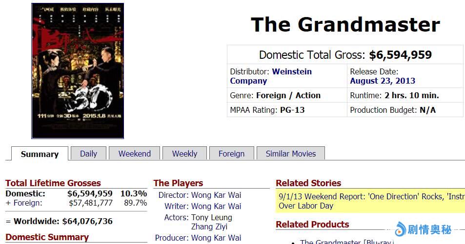 《一代宗师》是很火热的“咏春”功夫题材,业内很多人都看好它在海外市场的票房表现,遗憾的是男女主角号召力一般没能扛起票房。该片在北美收得659万美元,这个成绩比起《霍元甲》差得很远,就更不用说去跟《英雄》《卧虎藏龙》比较了。其实在欧美观众眼中功夫电影他们只认李连杰,连成龙都不行就更不用说梁朝伟了,章子怡在片中倒是很惊艳给人不小惊喜。