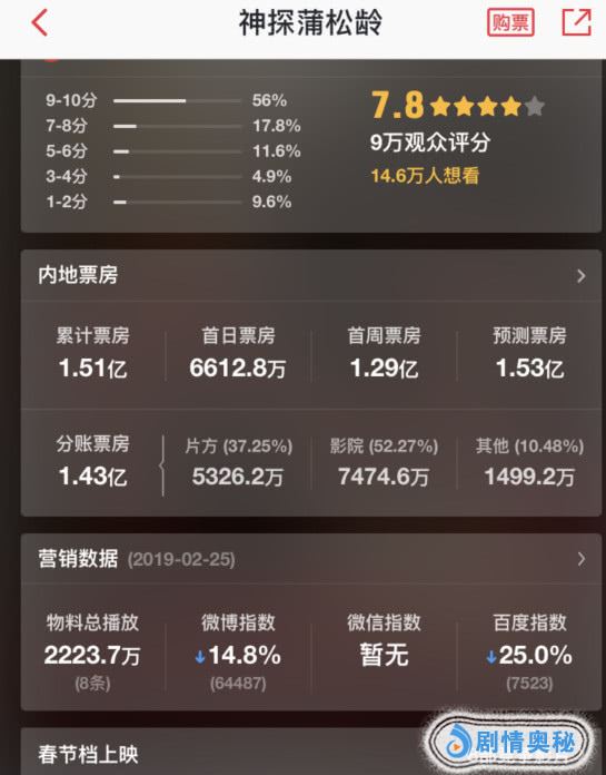 《神探蒲松龄》累计票房为1.51亿,排在春节档8部大片的倒数第三名