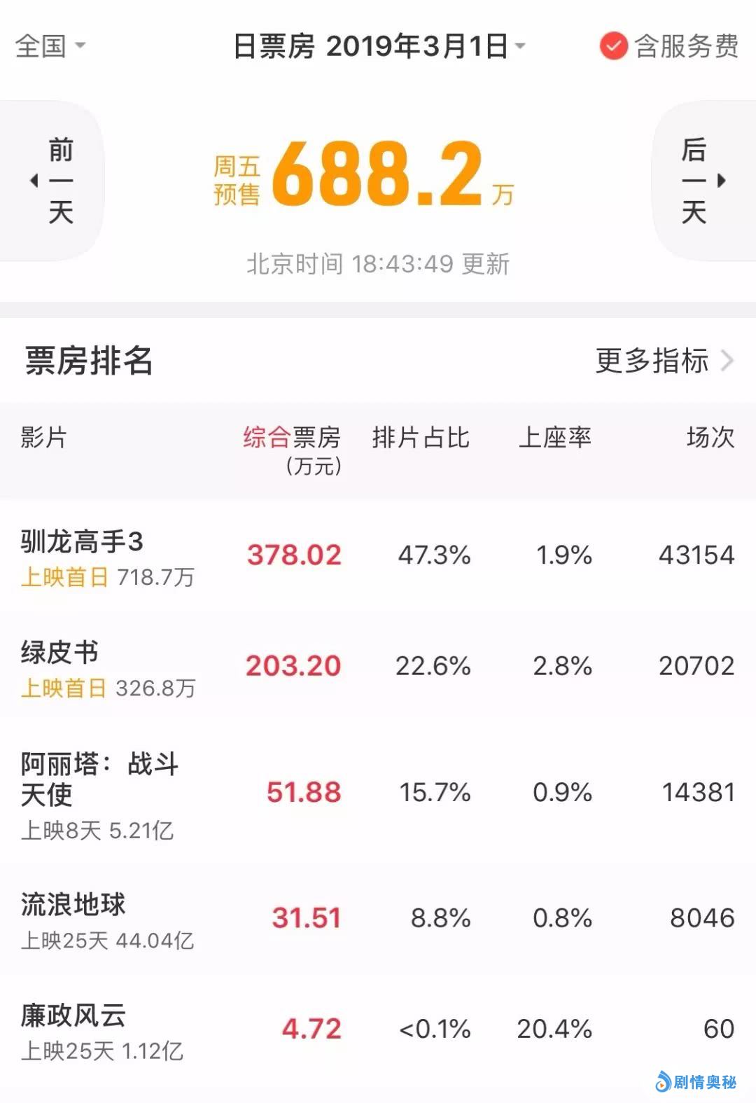 仅仅过去一天,《绿皮书》的排片比在26日晚间,变增长到了22.6%,3月1日上映首日,全国预排场次超过2万场,预售则突破了200万。