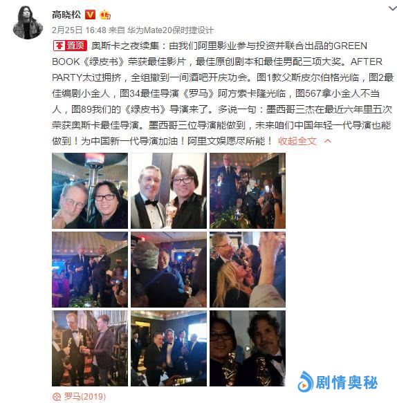 除了奖项,当天在微博上引起关注的,则是作为投资方代表,以阿里娱乐战略委员会主席身份出现在奥斯卡红毯上的高晓松。他晒出了自己在红毯上的自拍,以及与《绿皮书》编剧、制片人,主人公托尼·维伦朗格之子尼克·维伦朗格的合影。