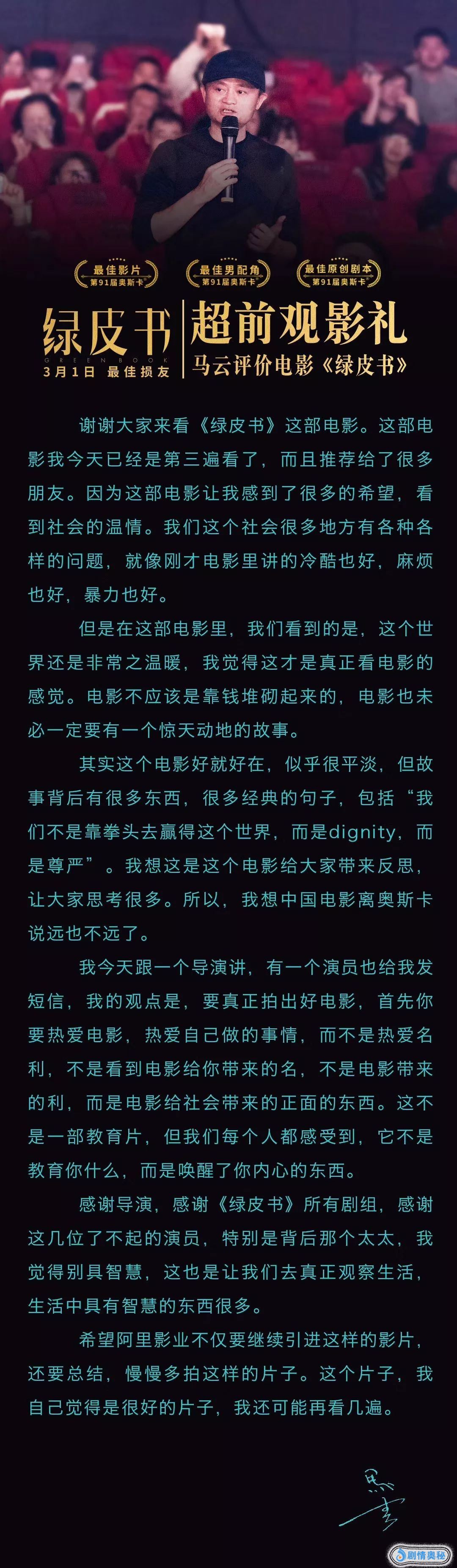 最后,看了3遍《绿皮书》的马云站出来讲了这样一番话:“好电影不是钱堆出来的,也不一定要有惊天动地的故事,看似平淡也一样可以动人。”