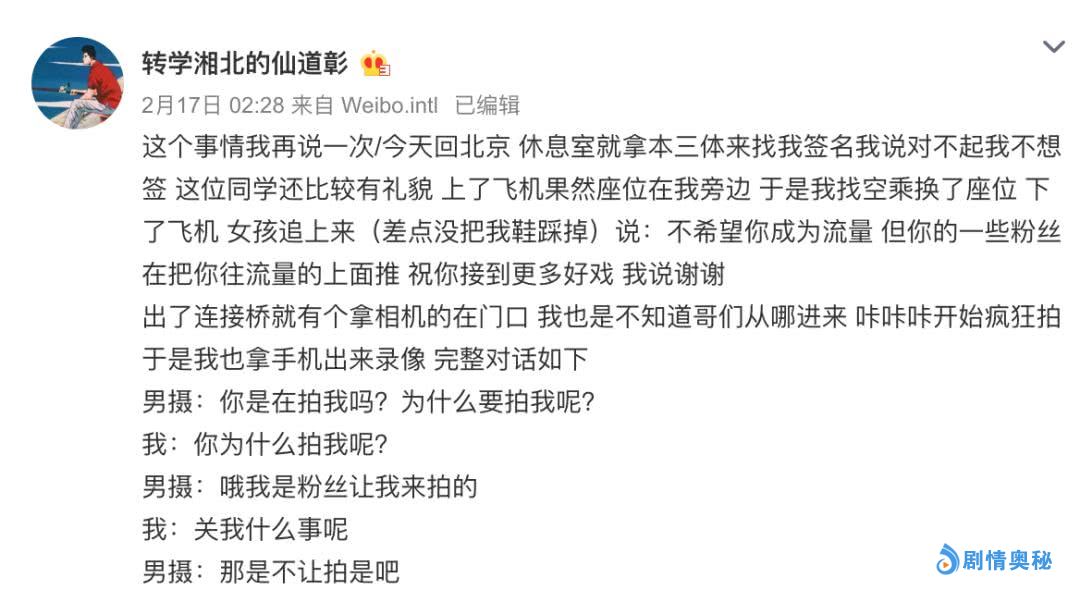 屈楚萧于微博小号”转学湘北的仙道彰“发布怒斥私生和黄牛的信息