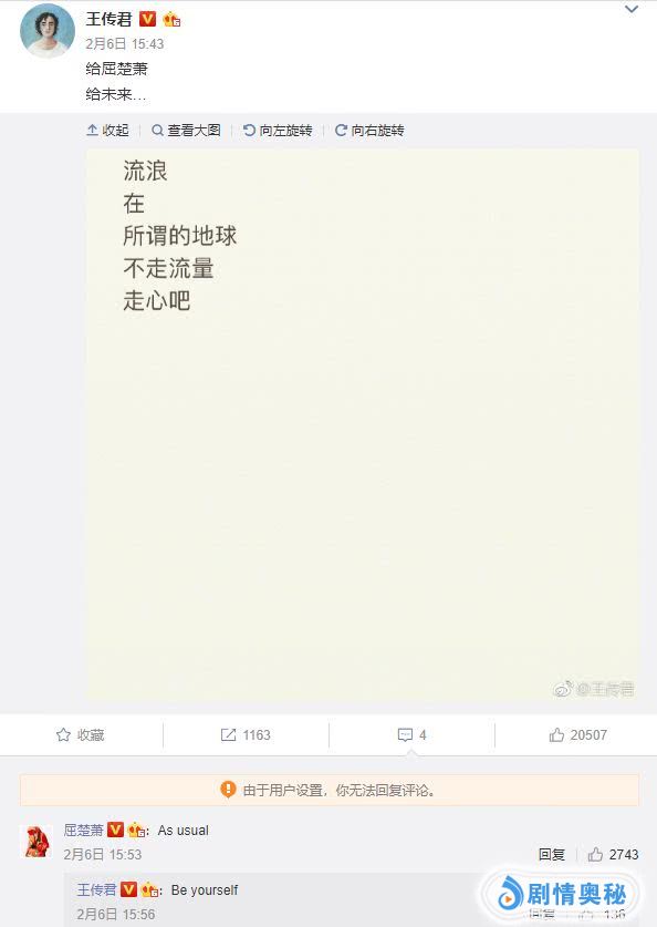 王传君在微博上支持屈楚萧做自己,并称“流浪在所谓的地球,不走流量,走心吧”