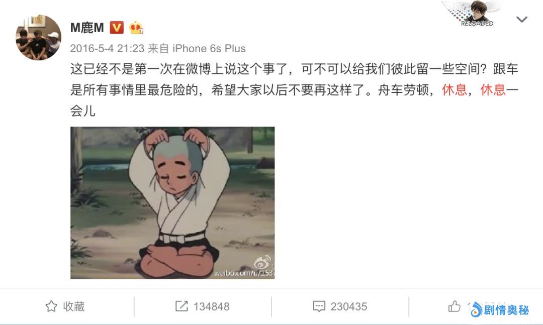 2016年,鹿晗因“黄牛”带粉丝疯狂追车差点出事,在微博上发布消息称“跟车是所有事情里最危险的”,希望粉丝以后”给彼此留一些空间“。