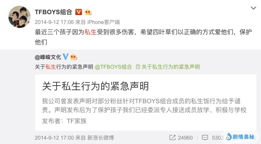 早在2014年,由王俊凯、王源、易烊千玺组成的“TFBOYS”组合就曾发表声明,公开斥责一些“私生饭”尾随、偷拍、追车,甚至在成员学校、家门围堵等的恶劣行为。